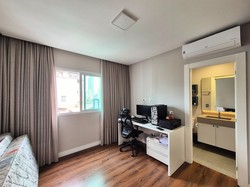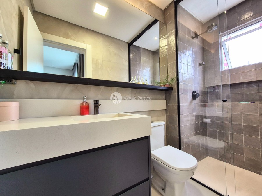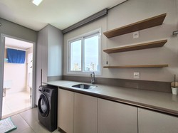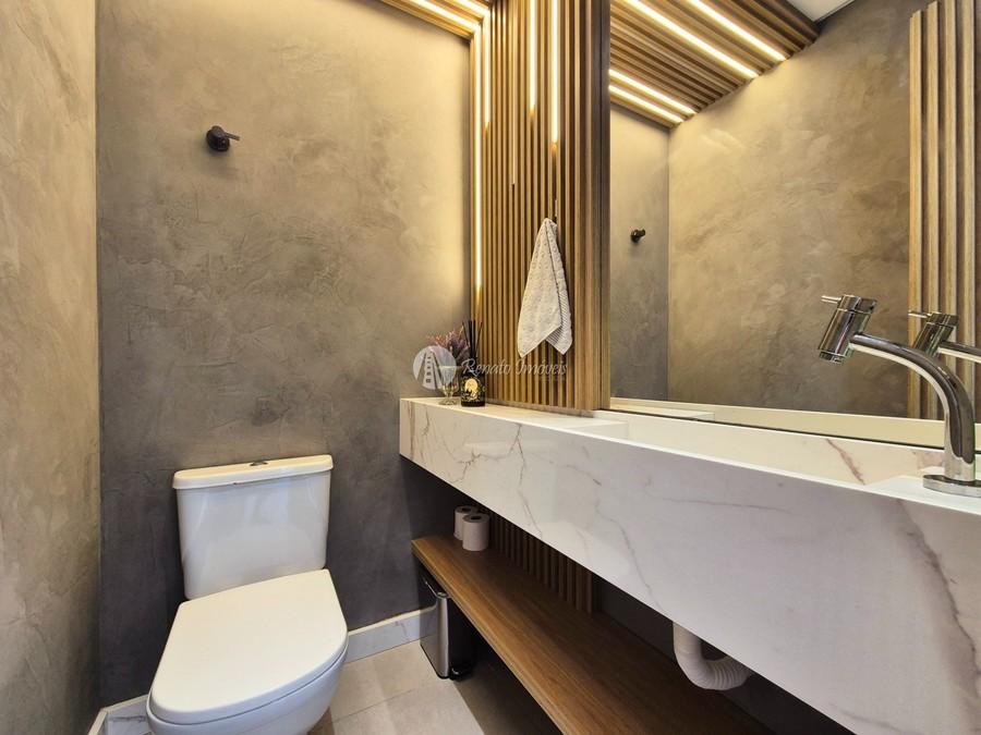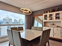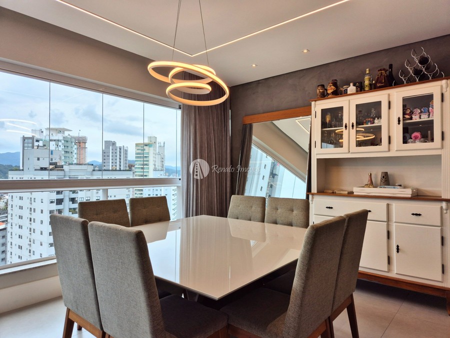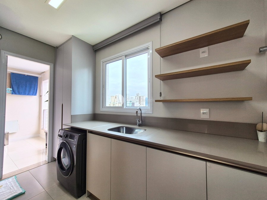 O imóvel conta com 3 suítes, lavabo, churrasqueira à carvão, mobília sob medida, 3 vagas de garagem e 120m² privativos, além de infraestrutura completa no edifício.