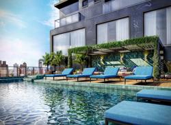 Deck com quiosque grill ao lado da piscina